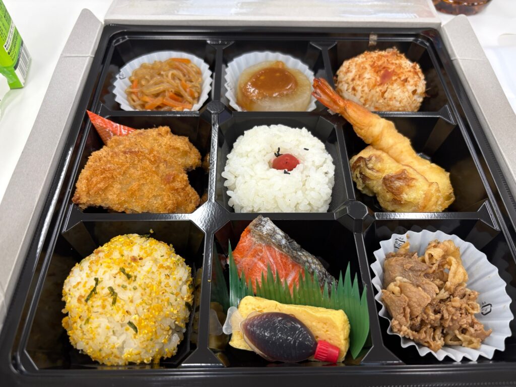 お昼ご飯は、この席のままお弁当をいただきました。参加費は1,100円だったのですが、お弁当がすごく豪華で嬉しかったです。笑